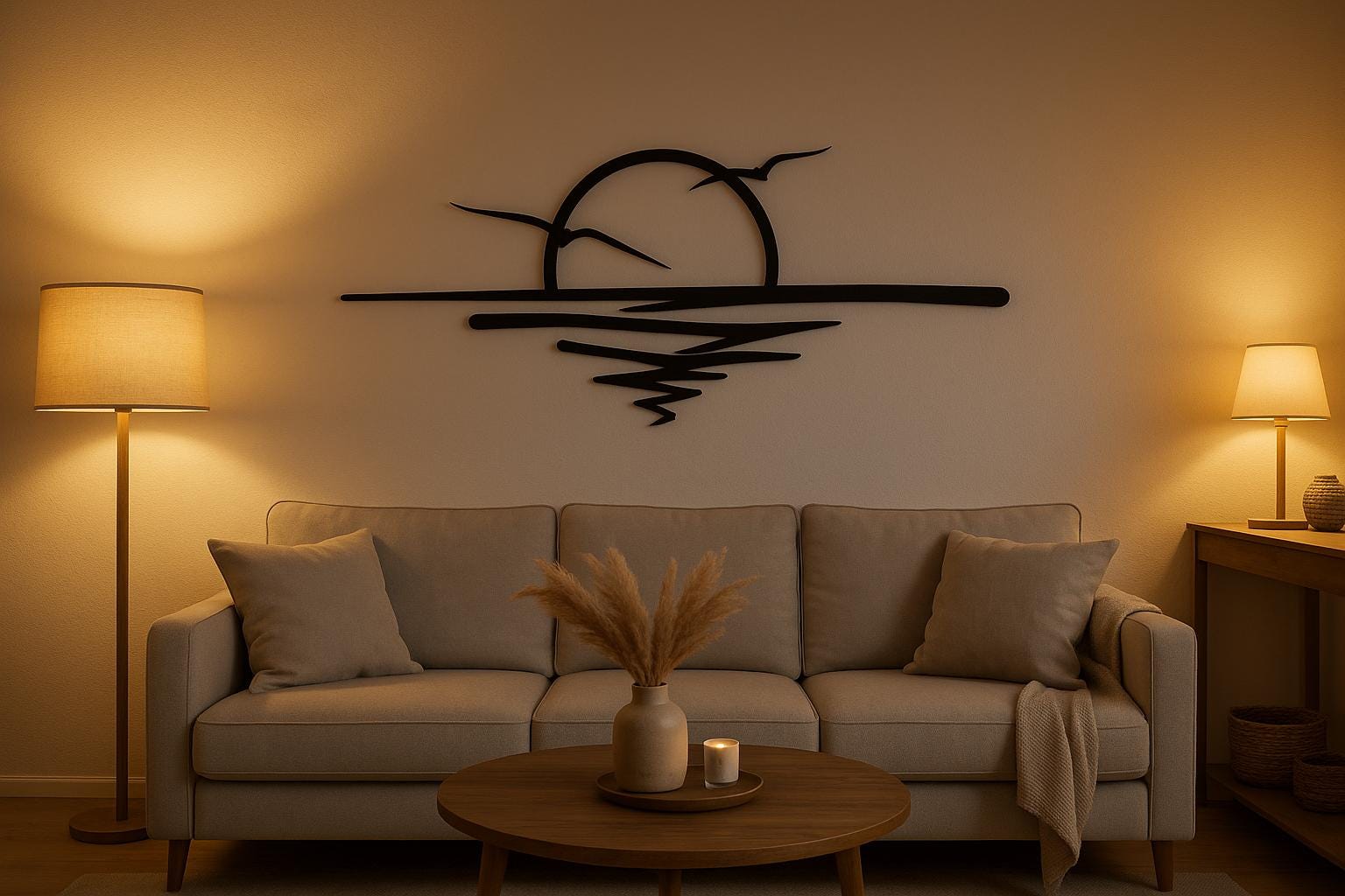 Bu Minimalist Gün Doğumu ve Kuşlar Metal Duvar Sanatı ile dingin bir gün doğumunun güzelliğini evinize taşıyın. Modern, kıyı veya doğadan ilham alan iç mekanlar için mükemmel olan bu parça, her mekana zarafet ve huzur katar.