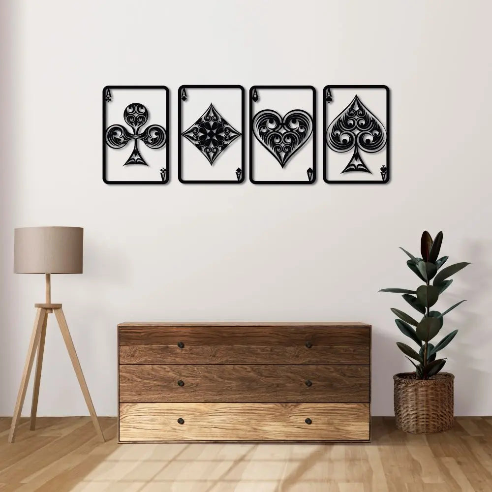 Şansın ve stratejinin sembolü dört As kartı, metal duvar dekoruyla evinizde canlanıyor. Asların ince detaylarla işlenmiş tasarımı, dekorasyona zarafet katarken aynı zamanda odanıza eğlenceli bir hava getiriyor. Poker tutkunları için özel olarak tasarlanan bu dekor, tarzınızı yansıtarak mekana özgün bir dokunuş katacak.